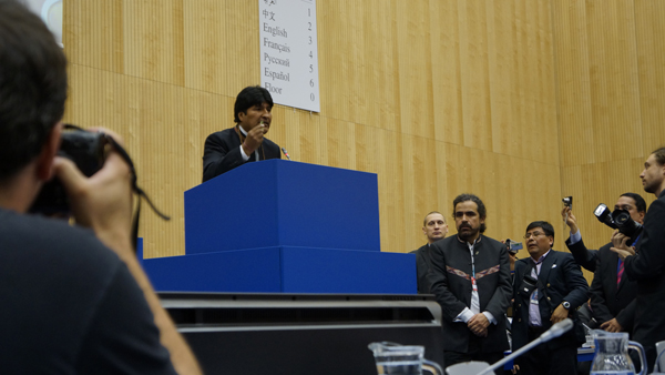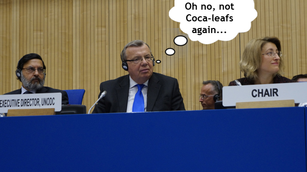 In 2009 we showed you how Evo Morales, President of Bolivia, chewed a Coca-leaf at the UN headquarter in an effort to convince the Commission to „correct a historical error” – delete those parts of the Single Convention that aim to eliminate coca chewing in the Andes. When we saw that he was going to speak this year at the opening plenary we knew that he will repeat his performance – but we did not expect that he will even upgrade it! He was not chewing Coca but he presented a couple of other industrial Coca-products beside the leaf itself: tea, beverage, food. The public show was much appreciated and applauded by government delegates who rarely see anything else than the boring CND standard-speeches on endless lists of police seizures and the need for coordinated actions to tackle the world drug problem blabla. Some distinguished delegates almost pissed themself laughing at the story on how Morales cured his own stomach ache with Coca-tea.