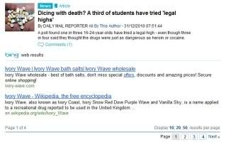 Még ironikusabbá teszi a helyzetet, hogy a dizájnerekre irányuló figyelemfelkeltés mellett a médiatermékek esetenként tényleges reklámfelületet nyújtanak a vehemensen támadott dizájner drogoknak. Alább egy (nagyon apró) screenshot látható 2012. június 7-ről egy „ivory wave”-re (egy másik dizájner drog) irányuló keresés után a Mail weboldalán:
