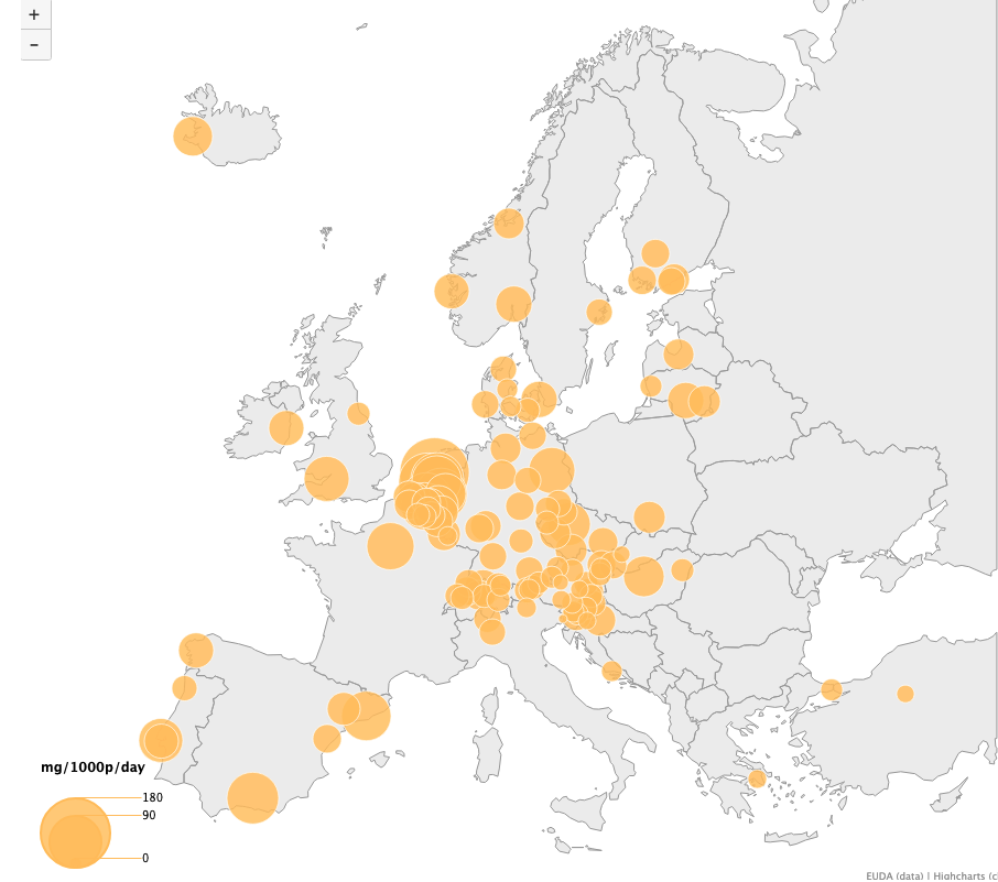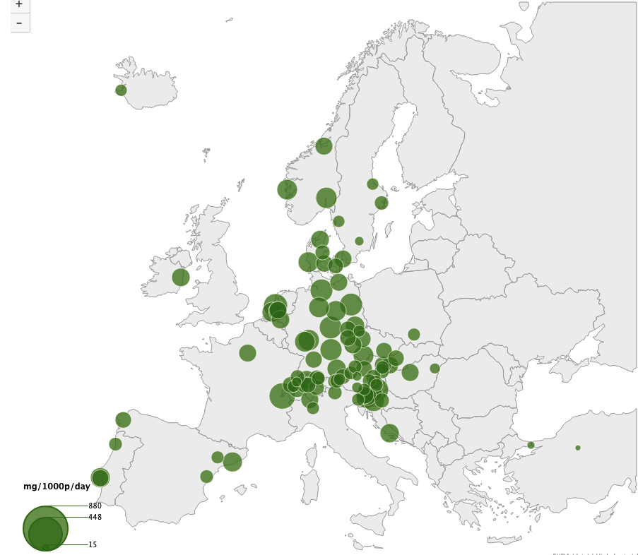 A budapesti szennyvíz MDMA-koncenctrációja például magasabb Debrecennél (9,72), Bécsnél (17,71), Bratislavánál (15,69), Zágrábnál (26,14), Dublinnál (33,77), Oslónál (36,10) vagy Koppenhágánál (36,81), és még Reykjavíknál (43,84) is valamivel magasabb. Ugyanakkor jóval alacsonyabb, mint Prága (56,27), Berlin (66,52), Párizs (70,97), Barcelona (77,44), vagy különösen a holland városok, például Amszterdam (179,66), Rotterdam (115,95) és Utrecht (93,05). .