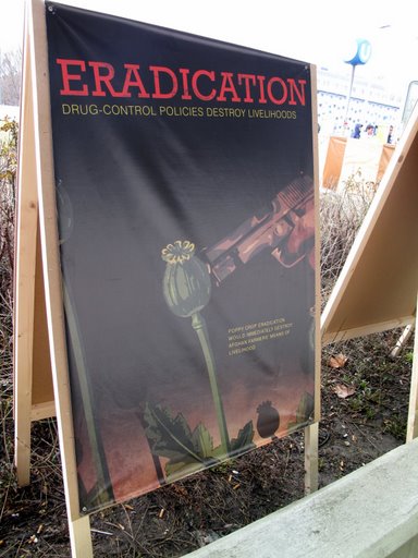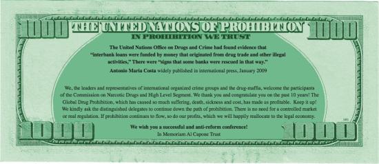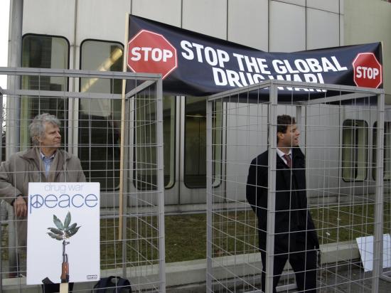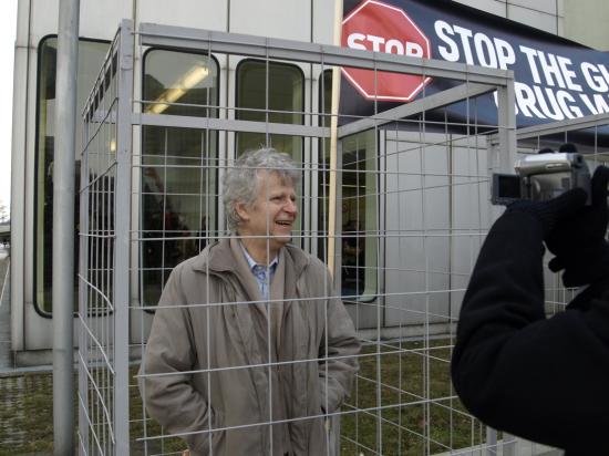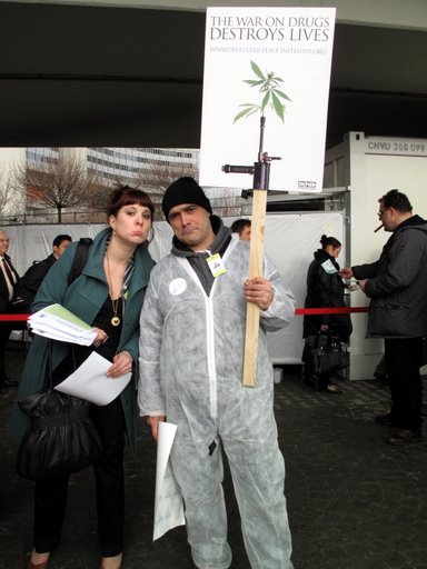Reggel 9-kor egy szabadtéri sajtótájékoztatót tartottunk, ahol a megszólalók (a TASZ-ból, az INPUD-ból, az ENCOD-ból és a Students for Sensible Drug Policy részéről) rámutattak arra a hatalmas szakadékra, ami a valóság és az ENSZ által képviselt drogpolitika között tátong. Minden szónok a ketrecekből adott interjút. Szimbolikus vizelettel teli tartályokat is felállítottunk, hogy rámutassunk a drogellenes háború abszurditására. Hamis 1000 dollárosokat osztogattunk Costa fényképével és egy szöveggel, amely a fiktív Al Capone Alapítvány szignált. A szövegben a bűnözők nemzetközi hálózata gratulált a kormányzatoknak, hogy megőrizték a drogok illegalitását, ezzel hatalmas adómentes bevételt teremtve számukra.