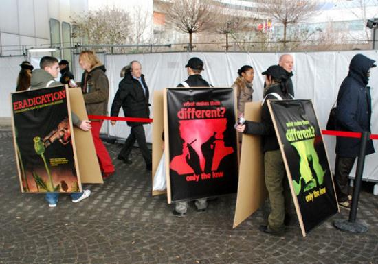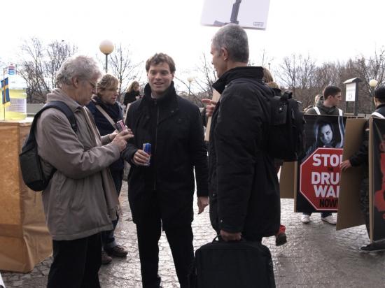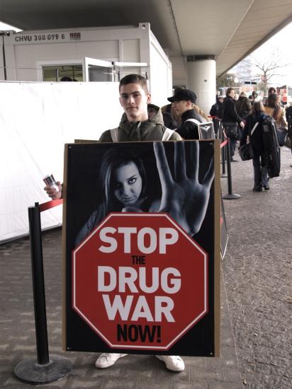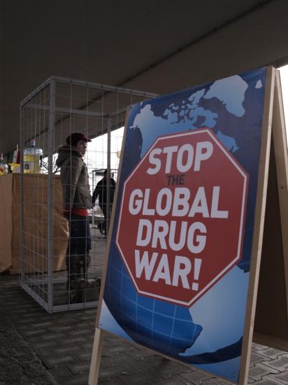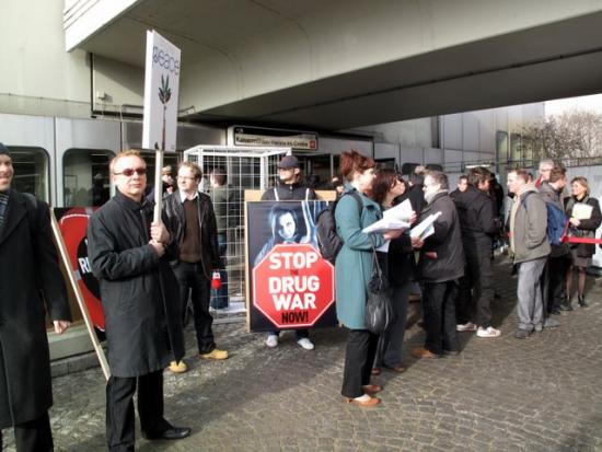 Szerdán reggel demonstrációt szerveztünk a Vienna International Centre bejáratánál, annál az épületnél, ahol az ENSZ magas szintű találkozóját tartották. Az állami delegáltak március 11-12-én itt vitatták meg a jelenlegi drogszabályozás hatékonyságával kapcsolatos kérdéseket és új Politikai Deklarációt fogadtak el a drogokról. A globális drogellenes háború egyértelmű elhibázottsága és jól ismert nem kívánatos következményei ellenére nyílt titok volt már a találkozó előtt, hogy a kormányzatok nem szakítanak a jó öreg „keményen fellépünk a drogok ellen” megközelítéssel. A deklaráció tervezete még csak nem is említette az ártalomcsökkentést, amely a leghatékonyabb eszköz a drogokkal kapcsolatos halálozások és betegségek megelőzésében! Ahogyan vártuk, a kormányzatok a rossz döntést hozták meg és egy olyan deklarációhoz csatlakoztak, amely az 1998-as dokumentum irrealisztikus és ártalmas szlogenjeit visszhangozza. A hivatalos találkozóról itt olvashat többet.
