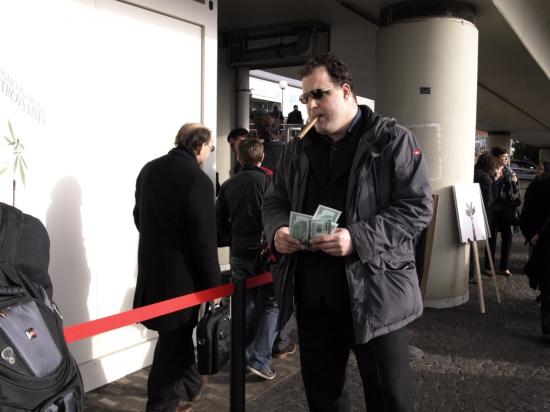 Varga Tamás, a TASZ maffiózónak álcázott munkatársa hamis, Costa fejes bankjegyeket osztogat