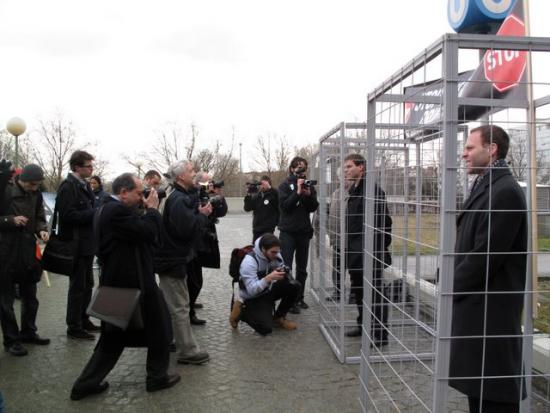Sajtótájékoztató ketrecekből – Bal oldalon Kris Krane az SSDP-ből