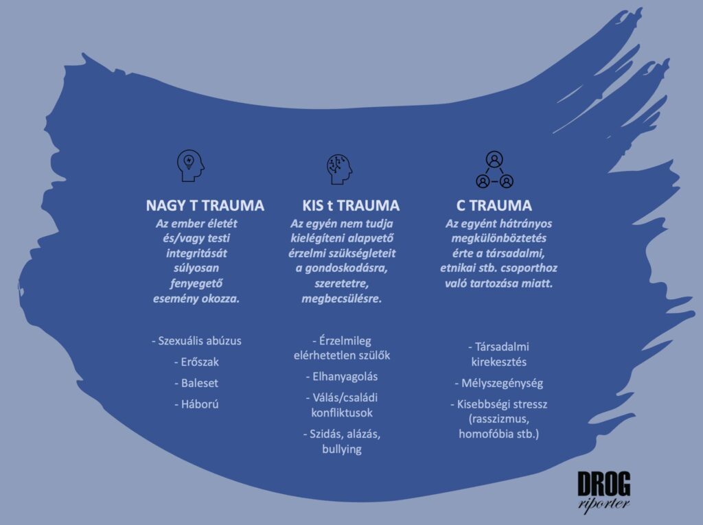 Gyakran megkülönböztetik a Traumát, nagy T-vel, és a traumát, kis t-vel. Az előbbi az életet vagy az ember testi integritását alapvetően fenyegető események következtében alakul ki. Ez a ritkább – bár sajnos egyáltalán nem annyira, mint sokan gondolják. A kedvezőtlen gyermekkori élményeket (ACE) mérő vizsgálatok szerint nagyon gyakran áll a súlyos pszichés és viselkedési zavarok eredőjében.