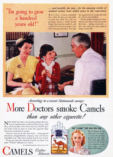 „Hála az orvostudománynak ma már 100 évet is élhetünk” – tudja meg az ötéves kislány a doktor úrtól, majd azt is, hogy az orvosok többsége Camel cigarettákkal teszi élvezetesebbé ezt a hosszú életet.