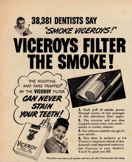 38381 fogorvos állítja, hogy a Viceroy cigaretták nikotinja és kátránya – hála a filternek, amely megfogja azokat – nem színezi el a fogakat. Szívjon Ön is Viceroyt!
