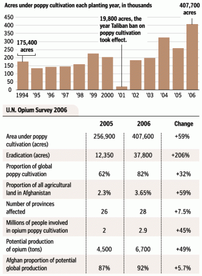 Afganisztán az ENSZ legfrisebb becslései szerint a világ heroinutánpótlásának 92%-át biztosítja, tavaly rekordtermést könyvelhetett el, több mint 50%-os (!) növekedést regisztráltak az ópiumtermésben – idén pedig még ennél is többre számítanak az elemzők. A nemzeti jövedelem mintegy fele az ópiumkereskedelemből származik, ami ugyanakkor nem gyarapítja a legális nemzetgazdaságot. A Karzai kormány drogellenes minisztere nemrégen lemondott a posztjáról, mivel nem volt képes az általa vállalt ópiumirtó politika teljesítésére. Az amerikaiak és az amerikai pénztől függő ENSZ drogellenes hivatali azonban nem hajlandók elismerni a kudarcot, ehelyett a drogellenes háború kiterjesztését tervezik. Így például korábban beszámoltunk róla, hogy a Kolumbiában már alkalmazott – és rengeteg emberi szenvedés árán csekély sikert hozó – permetezési kampányt szeretnék kiterjeszteni Afganisztánra is. Keveset törődnek azzal, hogy az ópiumültetvények kiirtása az afgán parasztok legfőbb megélhetési forrását is tönkreteszi, éhínségek és járványok törhetnek ki. Az eladósodott, nincstelenné tett parasztok pedig a tálibok karjaiba rohannak, akik védelmet ígérnek nekik a kafiroktól (hitetlenektől) és az általuk irányított bábkormánytól. A tálibok, akik 2000-ben a világ leghatékonyabb ópiumtilalmi rendszerét vezették be Afganisztánban, jelenleg szorosan együttműködnek az ópiumkereskedőkkel, akik a legmodernebb fegyverekkel és technikával látják el őket. Az amerikaiak nem csak az ópium elleni háborút veszítették el, de az emberek elméjének, gondolkodásának uralásáért folytatott háborút is. Az Afganisztán megszállását az amerikai erőktől átvevő NATO csapatok európai alakulatai sem értenek egyet az amerikai politikával: szerintük értelmetlen a mákültetvények kiirtása addig, amíg a földműveseknek nem biztosítanak alternatív megélhetési forrást. A moralizáló amerikai és a pragmatikus holland drogpolitika közötti ellentét Afganisztánban is fellángolt: az Uruzgan tartományt megszálló hollandok irtóznak az irtóhadjárattól, ehelyett inkább munkahelyteremtéssel és újjáépítéssel foglalkoznak.