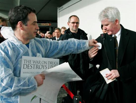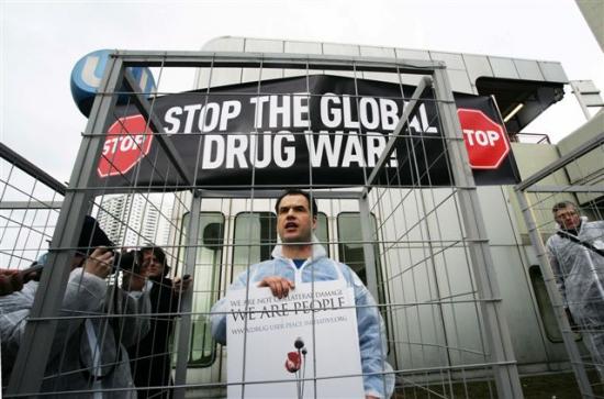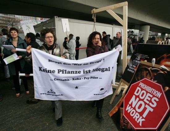 On Wednesday morning we organized a demonstration at the entrance of the Vienna International Centre, the building where the UN high level meeting on drugs was held. Government delegates gathered here from March 11 to 12 to discuss the effectiveness of current drug control policies and to adopt a new Political Declaration on drugs. Despite the tremendous evidence on the failure and uninintended consequences of the global drug war, it was an open secret even before the meeting that governments will not break with the old "tough on drugs" approach. The draft text of the declaration did not even mention harm reduction, the most effective tool to reduce drug related deaths and disease! As we expected, the governments made a wrong decision and signed a declaration that in many ways simply repeated the irrealistic and harmful slogans of the 1998 document (read more about what happened at the official meeting here).