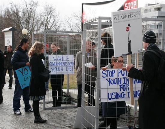 We think it was a great success: all delegates and journalists who came to the meeting had to watch our banners: "Stop the Global War on Drugs", "Harm Reducton Saves Lives" and "Prohibition Does Not Work". We exhibited the best posters of our Unintended Consequences contest, the police to let the banners and posters stay for 2 days, so everybody who entered the building could see our message. We thank for all the enthusiastic activists who contributed to this event, especially those from INPUD, ENCOD and Youth Rise, who had their own banners and standed in the cages prepared by us to symbolize the isolation and exclusion of people who use illicit drugs!