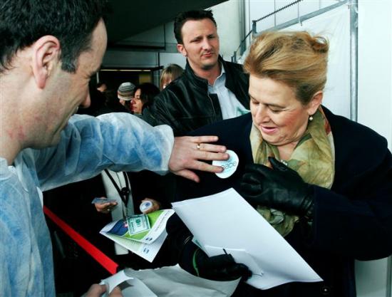 Tamas Varga, an HCLU activist dressed like a mafioso is distributing fake-banknotes with Costa's head