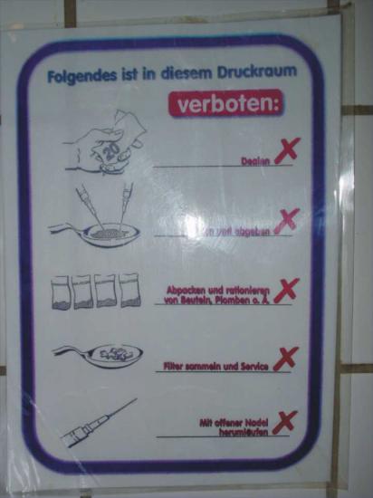Josch Steinmetz: És hasonlók. De a valóságban egészen máshogy viselkednek, mint ahogy mondják. Nagyon keveset tudnak róla, de mindenki azt hiszi profi. Viszont ha a szobában túladagolás történik, tizenegy másik ember látja, hogy hogyan kell megfelelően kezelni, ez pedig meglehetősen direkt oktatás. Egy másik érv szerint viszont, ha nincs még kontakt központ, nem érdemes szobát nyitni. Okosabb először kontakt központot nyitni, ahol meg lehet hallgatni az embereket, és fel lehet mérni az igényeiket. És ha azt mondják, hogy nem kell a müzlid és az almád, sem a szóróanyagaid, én nekem egy hely kell ahol injektálhatok, akkor érdemes elgondolkodni rajta. Ha pedig az emberek többé kevésbé nyíltan injektálnak, egy fa mögött a parkban, vagy WC-kben, az természetesen szintén érv a szoba megnyitása mellett.