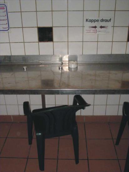 Josch Steinmetz: Igen. Itt a használók többnyire öregebbek, a gyerekek inkább Berlinben vannak. Néha jönnek ide fiatalok, de 17 évesnél nem fiatalabbak. Van legális lehetőségem, hogy hagyjam őket injektálni itt, ha a szülők írtak egy engedélyt, ami őszintén szólva nem túl realisztikus, vagy ha a felelős ifjúsági osztály írt egy engedély. De az ifjúsági osztályok általában a helyi önkormányzathoz tartoznak, így megint nem túl életszerű mondjuk odatelefonálni egy kisvárosba azzal, hogy ’itt egy gyerek az Önök városából, lennének szívesek egy engedélyt átfaxolni hogy cracket[4] injektálhasson?’ Dehogy is. Szerencsére itt a második emeleten ifjúsággal foglalkozó utcai munkások dolgoznak, és lehívhatjuk őket segíteni. Az ifjúsági törvény révén sokkal jobb lehetőségeik vannak mint nekünk, azonnal kibérelhetnek egy hotelt és felvehetik a kapcsolatot a Cafe Fix-szel ételért és további információkért. És jól is van így. Nincs problémám a használó-szobával fiataloknak, de másmilyennek kell lennie, kisebbnek, több szociális munkással, mert a fiataloknak másra van szükségük, mint az öregebbeknek.