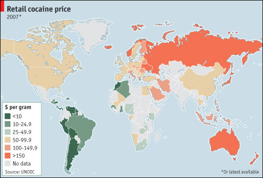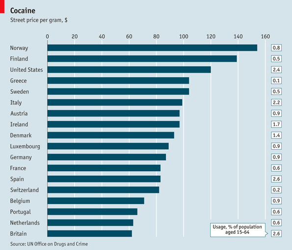 Az Economist az ENSZ adatai alapján az alábbi táblázatot közölte a kokain utcai áráról és a kokain-fogyasztók arányáról a világ különböző országaiban. Az elmúlt évtizedben a kokain fogyasztói ára jelentősen csökkent Európában, még akkor is, ha az inflációt belekalkuláljuk. Ezzel párhuzamosan fokozatosan bővül a nyugat- és dél-európai kokain-piac: a fogyasztásban élen jár Anglia, Spanyolország és Olaszország. Az észak- és kelet-európai térségben is csökkent a kokain ára, de itt még mindig az amfetamin típusú stimulánsok fogyasztása terjedt el. A táblázat nem tartalmazza a kokain magyarországi árát: a Nemzeti Drog Fókuszpont adatai szerint az átlagos utcai ár 14 ezer forint (kb. 75 USD) körül mozog, a felnőtt népesség körében pedig százból legfeljebb egy ember próbálta ki ezt a szert. Az EMCDDA honlapján találhatunk egy táblázatot a kokain fogyasztói árának alakulásáról az EU tagállamaiban.