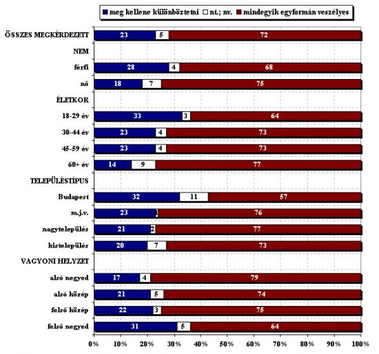4. ábra: Egyesek szerint a jogban meg kellene különböztetni az egészségre különösen veszélyes kemény-drogokat, és az enyhébb hatású, kevésbé káros könnyű drogokat. Mások azt mondják, nincsenek könnyű drogok, minden kábítószer súlyosan veszélyezteti a fogyasztókat és a társadalmat. Melyik vélemény áll közelebb az Önéhez: meg kellene különböztetni a kemény és a könnyű drogokat vagy minden kábítószer egyformán veszélyes?