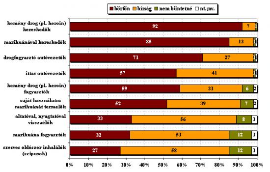 MEGJEGYZÉS: A fenti ábrából kiderül, hogy a közvélemény aránytalanul veszélyesebbnek tartja az illegális szereket a legális szereknél – mint korábban már írtuk, ez a kép nem felel meg a tudományos bizonyítékoknak. A többség szigorúan büntetné a heroinfogyasztókat (59% börtönbe zárná őket), míg a szerves oldószerek inhalálását – amely sok szempontból még a heroinhasználatnál is károsabb az egészségre – csupán 27% büntetné börtönnel. A marihuána fogyasztóit ugyanakkor 53% csupán szabálysértési bírsággal büntetné, 12% pedig egyáltalán nem büntetné, és csak egy kisebbség (32%) fenyegetné börtönnel – ebből az tűnik ki, hogy a közvélemény túlnyomó többsége (65%) nem tartja jónak a jelenlegi büntetőjogi szabályozást és annál jóval enyhébb szankcionálást tart szükségesnek.