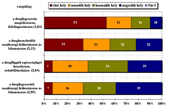 MEGJEGYZÉS: A következő táblázat azt szemlélteti, hogy a közvélemény milyen súlyt helyez a drogpolitika különböző beavatkozásaira. A többség (53%) a megelőzést és felvilágosítást helyezi az első helyre, míg a drogfogyasztók büntetőjogi üldözését mindössze 7% tartja elsődleges fontosságúnak, míg 67% utolsóelőtti vagy utolsó helyre tenné azt. A lakosság továbbra is fontosnak tartja a drogkereskedők rendőrségi felderítését – ami a jelenlegi helyzettel szemben, amikor az eljárások több mint 80%-a fogyasztók ellen indul, a szabálysértési reformmal a rendőrség prioritásáv válhatna. Sajnos a kezelés és rehabilitáció a közvélemény számára nem rendelkezik még az őt megillető súllyal, holott például egyes amerikai kutatások szerint minden egyes kezelésre költött dollár hétszeresen megtérül a büntető-igazságszolgáltatás számára – hiszen kiragadja a legproblémásabb drogfüggőket az illegális drogpiacból.