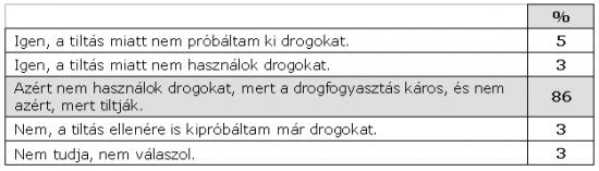 MEGJEGYZÉS: A büntetőjogi tiltás pártján állók szerint a jelenlegi szigor fenntartása melletti fő érv az, hogy nagyon sok ember azért nem próbálja ki ezeket a szereket, mert ez tilos. A közvéleménykutatás azonban azt bizonyítja, hogy a többség ezen döntését egyáltalán nem befolyásolja a Büntető Törvénykönyv. Az emberek majdnem 90%-a azért nem próbálja ki a kábítószereket, mert azt károsnak tartják, és mindössze 5% az, aki nem próbálta ki a drogokat a tiltás miatt. A büntetőjogi tiltásnak nincs visszatartó ereje a droghasználók számára – különösen nem azon fiatalok számára, akik egyébként is hajlamosak a különféle deviáns magatartásokra, és akik a leginkább veszélyeztetettek a drogfüggőség szempontjából.