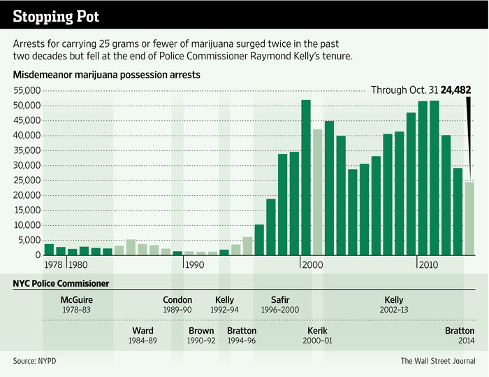 New Yorkban a fű miatti előállítások száma a 90-es években drasztikusan nőni kezdett, de 2011 óta jelentősen csökkent. Ekkor ugyanis a rendőröket arra utasították, hogy ne intézkedjenek azon fogyasztókkal szemben, akik nem nyilvánosan hódolnak szenvedélyüknek. 2011-ben még 52 ezer embert, 2013-ban már csupán 30 ezer embert állítottak elő fű miatt. “A tény, hogy kevesebb szükségtelen előállításra kerül sor, New York színes lakosságának, de különösen a színes fiataloknak használ,” jelentette ki a polgármester. A mostani lépés igazodik ahhoz a trendhez, aminek részeként a fűtilalom egyre inkább visszaszorul: idén három új állam döntött úgy, hogy legalizálja a fűpiacot.