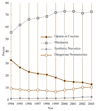 Az FBI múlt hétfőn megjelent Egységes Bűnügyi Jelentése szerint (Uniform Crime Report) a kábítószerrel kapcsolatos rendőrségi előállítások száma az elmúlt évben elérte az 1,8 milliót – ez az összes büntetőeljárás 13,1%-át teszi ki az országban. A marihuánával kapcsolatos előállítások száma eközben elérte a 786 545-öt. A kábítószerrel kapcsolatos bűncselekmények elkövetési száma messze megelőz minden más elkövetési kategóriát: a vagyon elleni bűncselekményekkel kapcsolatos előállítások száma például 1,6 millió volt, tehát 200 ezerrel kevesebb, az erőszakos bűncselekmények miatt pedig 603 500 embert tartóztattak le. A hatósági szigor túlnyomórészt a fogyasztók ellen irányul: a kereskedelem, az előállítés vagy a termesztés az összes eseteknek mindössze 18%-át teszik ki, tehát mintegy 1,5 millió droghasználót fülelt le a rendőrség, közülük majdnem 700 ezret marihuána puszta tartása miatt. Az összes kábítószerrel kapcsolatos előállítások 42,6%-át tette ki a marihuána, a heroin és kokain 30,2%-ot, a szintetikus "és más veszélyes kábítószerek" pedig 27,2%-ot.