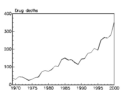 A droghalálozások (mind a „tű végi”, mind pedig a közvetett) folyamatosan emelkedtek a 70-es évektől kezdve Svédországban.