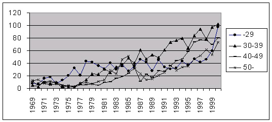 A halálozások növekedését nem magyarázza a droghasználók kiöregedése, a következő ábrán látható, hogy mindegyik korcsoportban hasonló növekedés tapasztalható.