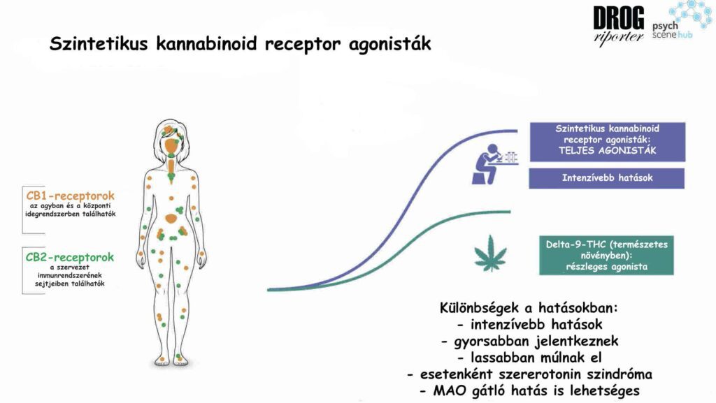 A szintetikus kannabinoidok hatásmechanizmusa azonban eltér a természetes kannabisz növény fő hatóanyagának, a Delta-9-THC-nak a hatásmechanizmusától. Míg a Delta-9-THC részleges agonista, addig az ismert szintetikus kannabinoidok teljes agonisták. Ez azt jelenti, hogy a szintetikus kannabinoidok jóval potensebbek, kevesebb dózisban is jóval nagyobb hatékonysággal aktiválják a receptorokat, mint a THC.